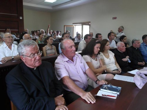 Duke qenë se jemi në vitin Jubilar të 100 vjetorit të Shtetit Shqiptar, nisur nga ky fakt, Konferenca Ipeshkvore e Shqipërisë, në emër te cilës jam duke folur, në Letrën Baritore, “Fides et Patria” (Fe e Atdhe), dt. 3 maj 2012, thekson se, veprimi i Zotit në historinë e shëlbimit duhet të bëhet shprehje e një projekti të madh edukativ fetare e kulturor, i orientuar drejtë një shtegu të ri që shpie në mirësi, dashuri dhe në respekt ndaj vlerës së madhe që ka jeta e secilit njeri e sidomos atij të Vitit Jubilar. Duke qenë i bindur se kjo Qendër e porsa përuruar do luaj një rol të rëndësishme në përhapjen e paqes, mirëkuptimit, studimit të vlerave të poetit Mjeda, shprehi përgëzimet e mija të sinqerta, duke i dëshiruar, punë të mbar dhe të suksesshme në promovimin e vlerave fetare dhe kulturore”.