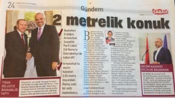 “Mysafiri i jashtëzakonshëm, 2 metra i gjatë”. Kështu e ka cilësuar Edi Ramën gazeta e Stambollit “Sabah”, në një shkrim ku jepen detaje nga takimi që kryeministri i ardhshëm shqiptar pati me kryeministrin turk Recep Tayyip Erdogan dje në Stamboll. “Kryetari i PS, 2.02 metra i gjatë, i cili dikur ka qenë basketbollist”, citohet në shkrimin e “Sabah”.