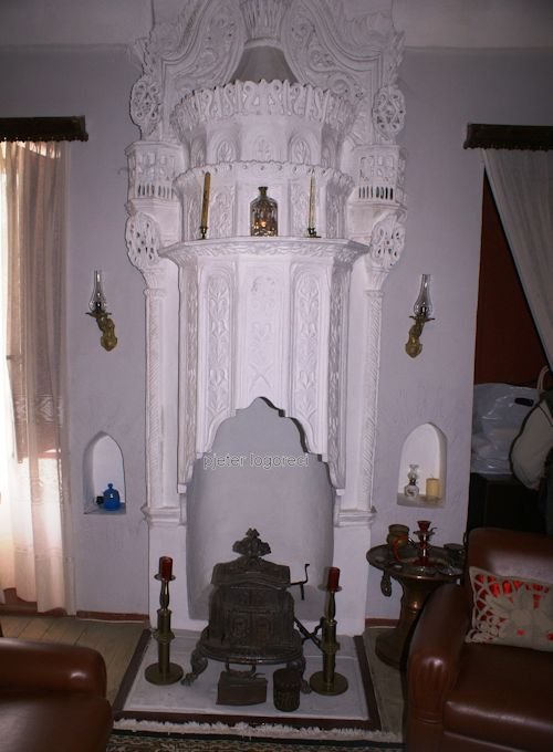 Bukuria dhe eleganca e gdhënieve me imitacione lulesh, apo motive popullore të shumë formash e llojesh, i japin pamje madhështore ambientit. Në ballë, në mes të dy dritareve të befason me bardhësinë e elegancen e tij një oxhak karakteristik i punuar me mjeshtëri në gips nga mjeshtrat e përmendur dibranë.