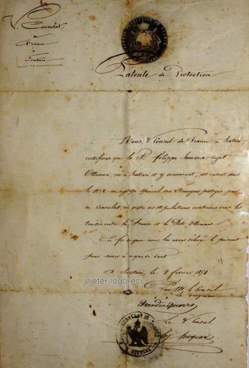 Sapo të afrohesh pranë murit ku varen kornizat me fotografi e dokumenta të radhë, të bie në sy një letër e vjetër sa formati A4 e shkruar bukur me dorë dhe që mban datën 8 shkurt 1854. Letra emërtohet “Certifikatë mbrojtje” (Patentë de Protection) lëshuar Filip Sumës – Çekës, i lindur dhe banues në Shkodër dhe verteton marrjen e tij nën mbrojtjen e konsullatës fraceze të Shkodres me të gjitha të drejtat sipas marveshjeve që republika e Francës kishte me Perandorinë Osmane. Dokumenti është lëshuar nga konsullata franceze dhe mban vulat e saj.
