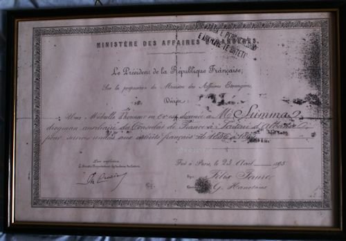 Objekt tjetër interesant për tu treguar është dhe dokumenti shoqërues i medjaljes së arit akorduar Mikel Sumës – Çekës, i cili nderohet nga ministria e punëve të jashtme e republikës franceze, për punën e tij të mirë si përkthyes i konsullatës në Shkoder në vitet 1856 deri 1895. Dokumenti mban mbishkrimin e presidentit të republikës franceze Felix Faure, Paris 23 prill 1895 dhe i është dorëzuar atij nga konsulli i kohës Hecquard. Ky dokument është kopjuar nga origjinali i cili ndodhet në arkivën e shtetit shqiptar në Tiranë.