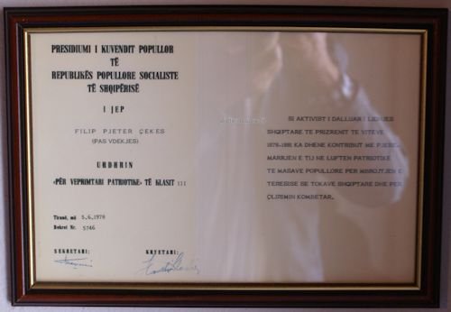 Një urdhër tjetër nderi për patriotin Filip Çeka që është dhënë nga presidiumi i kuvendit popullor, zë një vend të dukshëm në dhomë dhe mban datën 5.6.1978 … Motivacioni: …Si aktivist i dalluar i lidhjes shqiptare të Prizrenit në vitet 1878-1881. Ka dhënë kontribut me pjesmarrjen e tij në luftën patriotike të masave popullore për mbrojtjen e tërësisë së tokave shiqiptare dhe për clirim kombëtar…