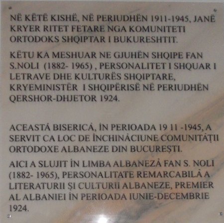 “Pllaka memoriale, e shpalluar sot (18 tetor 2012), fisnikëron këtë hapësirë të shenjtë të shpirtit të krishterë dhe jam krenar se kjo gjë ndodh në qytetin që e adiministroj”, theksoi fillimisht, kryetari i Bashkisë, Sorin Oprescu. Sipas tij, “Miqtë tanë shqiptarë, do ta kremtojnë së shpejti Njëqindvjetorin e independencës, rast me të cilin, kemi nderin që sot të përkujtojmë evenimentet dhe personalitetet e të shkuarës sonë të përbashkët. Janë një shumicë faktesh dhe ngjarjesh në historinë e përbujshme të Ballkanit, që kanë prurë afrimin e popujve tanë.