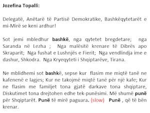 Gazeta Tema ka mundur të sigurojë fjalimin origjinal të zonjës Topalli, që lexoi në Konventën e fundit për punësimin të Partisë Demokratike.