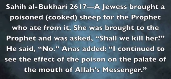 Sahih el-Buhari, 26I7 — “Një hebreje i solli mish deleje të helmuar (të gatuar) Profetit, i cili hëngri prej saj. Ajo iu soll Profetit dhe u pyet: “A ta vrasim?” Ai tha: “Jo.” Enesi shtoi: “Vazhdova ta shihja efektin e helmit në qiellzën e gojës së të Dërguarit të Allahut.”