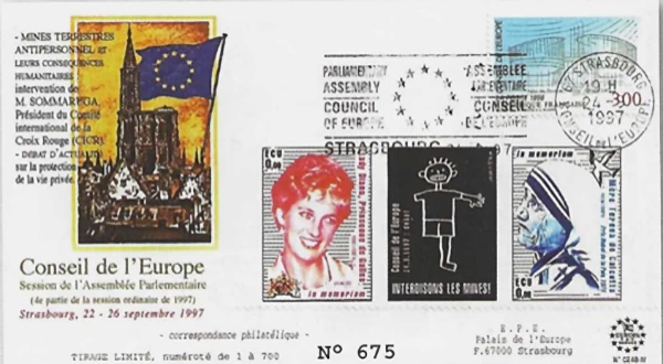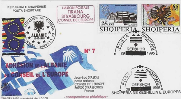 Në vitin 1995, Shqipëria u pranua në Këshillin e Europës, një moment që shënoi daljen e saj nga izolimi dhe hyrjen në “familjen demokratike europiane.” Eshte zarfi special ne fig.1 qe përkujton këtë ngjarje, me pulla që mbajnë shqiponjën dykrenare si simbol të identitetit kombëtar dhe flamurin europian si shenjë të aspiratës për integrim. Ky zarf është dëshmi e një kapitulli të ri, ku Shqipëria filloi të ndërtonte marrëdhënie institucionale me Europën.