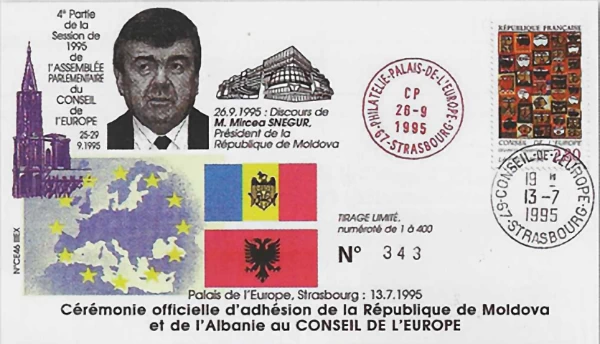 Po ne vitin 1995, një tjetër zarf si ai ne fig.2, përkujtoi ceremoninë e përbashkët të Shqipërisë dhe Moldavisë, ku flamujt e dy vendeve dhe portreti i presidentit moldav Mircea Snegur tregojnë hyrjen e vendeve të reja demokratike në Europë. Shqipëria shihej si pjesë e një procesi rajonal të tranzicionit demokratik, ku vendet e dalë nga komunizmi po gjenin vendin e tyre në strukturat europiane. Këto zarfe të vitit 1995 janë dëshmi e një momenti historik, ku Shqipëria u vendos në një rrjet institucional që mbron demokracinë, të drejtat e njeriut dhe sundimin e ligjit.