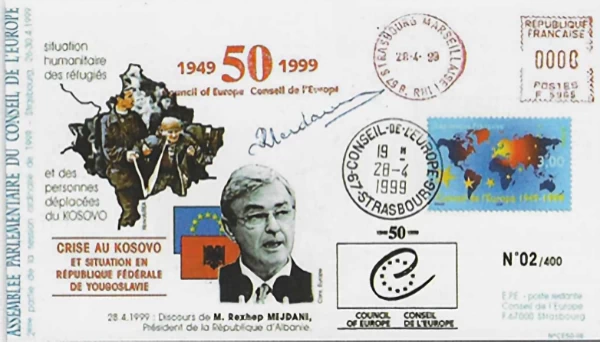 Po atë vit, me 1999, një tjetër zarf si ne fig.5 lidhet me krizën e Kosovës, duke e vendosur Shqipërinë në qendër të debatit humanitar. Portreti i presidentit Rexhep Meidani dhe flamuri shqiptar pranë atij europian e vendosin vendin si zë kryesor në mbrojtje të shqiptarëve të Kosovës. Ky zarf është një dokument politik që lidh përvjetorin e Këshillit të Europës me dramën humanitare në Ballkan, duke treguar se Shqipëria nuk ishte thjesht spektatore, por aktore aktive në mbrojtjen e të drejtave të popullit të saj. Në këtë mënyrë, filatelia bëhet një arkiv i krizave dhe solidaritetit, duke ruajtur kujtesën e një periudhe të vështirë për rajonin.