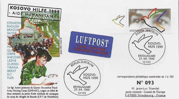 Zarfi i fig.6 i vitit 1999, i botuar në Berlin, përkujton ndihmën humanitare për refugjatët e Kosovës. Ilustrimi i një infermiereje që mban një foshnjë, kampet e refugjatëve dhe lista e qyteteve shqiptare ku u strehuan mijëra njerëz, e vendosin Shqipërinë në qendër të solidaritetit ndërkombëtar. Pulla me pëllumbin e paqes dhe postmark-u ‘Kosovo Hilfe 1999’ tregojnë se kjo krizë nuk ishte vetëm një dramë lokale, por një çështje europiane. Ky zarf është dëshmi se Shqipëria, përveç rolit politik, kishte edhe një rol humanitar, duke u bërë strehë për të shpëtuar jetë dhe duke u vendosur si pjesë e një rrjeti më të gjerë ndihme ndërkombëtare.