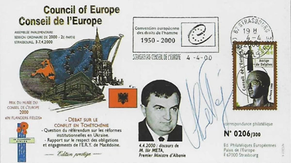 Në vitin 2000, përkujtohej 50-vjetori i Konventës Europiane për të Drejtat e Njeriut. Zarfi ne fig.7 i këtij viti paraqet portretin e kryeministrit Ilir Meta dhe flamurin shqiptar, duke treguar pjesëmarrjen aktive të Shqipërisë në debatin europian mbi të drejtat e njeriut. Pulla me tematiken e saj e lidh këtë moment me trashëgiminë kulturore europiane, duke treguar se Europa ndërton identitetin e saj mbi trashëgimi dhe vlera. Ky zarf është një dokument diplomatik që shënon se Shqipëria tashmë është pjesë e debatit europian mbi të drejtat e njeriut, se vendi po konsolidohej si aktor i denjë në arenën e vlerave demokratike. Në këtë kontekst, Shqipëria nuk shihet më thjesht si vend i ri anëtar, por si pjesë e një rrjeti që diskuton dhe vendos mbi çështje të ndjeshme ndërkombëtare, si konflikti në Çeçeni apo reformat institucionale në Ukrainë. Ky zarf është dëshmi e një faze të re, ku Shqipëria po afirmohej si pjesë e debatit europian mbi të drejtat e njeriut.