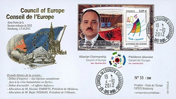 Një tjetër zarf si ai ne fig.9 i vitit 2012, i botuar në edicion të kufizuar, paraqet fjalimin e kryeministrit Sali Berisha në Strasburg gjatë presidencës shqiptare të Këshillit të Europës. Fotografia e tij duke folur në sallën plenare, bashkë me imazhin e ndërtesës së Këshillit, e vendos Shqipërinë në qendër të debatit europian mbi demokracinë dhe të drejtat e njeriut. Ky zarf është dëshmi se Shqipëria nuk ishte më thjesht pjesë e forumit, por kishte rol udhëheqës, duke kontribuar në diskutime mbi kriza globale si ajo e Egjiptit dhe mbi reformat institucionale të vetë Europës.