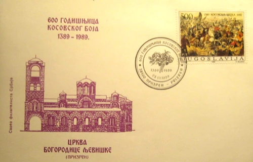 Ikonografia e betejës, gjuha cirilike dhe përzgjedhja e Prizrenit si vend simbolik për vulën postare krijojnë hapësirë ku realiteti historik dhe shumetnik i Kosovës fshihet qëllimisht. Nga këndvështrimi filatelik, fig.2 është një zarf përkujtimor zyrtar (FDC), i pajisur me pullë prej 500 dinarësh, vulë speciale dhe ilustrime të monumenteve fetare, megjithatë, funksioni i tij kryesor nuk është qarkullimi postar, por shërbimi i drejtpërdrejtë i propagandës politike dhe i një interpretimi të shtrembëruar të historisë.Krahasimi me fig.1 tregon një vijimësi ideologjike të qartë, në vitin 1939 miti shërben për konsolidim identitar te rreme, ndërsa në vitin 1989 ai shndërrohet në instrument mobilizimi dhe përgatitjeje për konflikt.