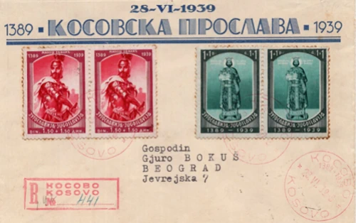 Zarfi perkujtimor dhe njeheresh i qarkulluar i vitit 1939 ne fig.1, i lëshuar me rastin e 550-vjetorit të Betejës së Kosovës, i përket fazës kulmore të filatelisë së Mbretërisë së Jugosllavisë. Përvjetori lidhet me Vidovdanin, një datë e shume vlersuar historike dhe fetare në kulturën politike serbe, ku beteja e vitit 1389 interpretohet jo si humbje ushtarake. Beteja e humbur kundër Perandorisë Osmane, e zhvilluar nga një koalicion ballkanik, përbën një rast pothuajse unik ne bote, ku humbja ushtarake është mitizuar dhe shndërruar në vlerë morale dhe shpirtërore, e kultivuar për shekuj në diskursin shtetëror serb. Historikisht, rikthimi te ky mit në prag të Luftës së Dytë Botërore synonte krijimin e një ndjenje vazhdimësie dhe stabiliteti simbolik në një Evropë të thellësisht të trazuar.