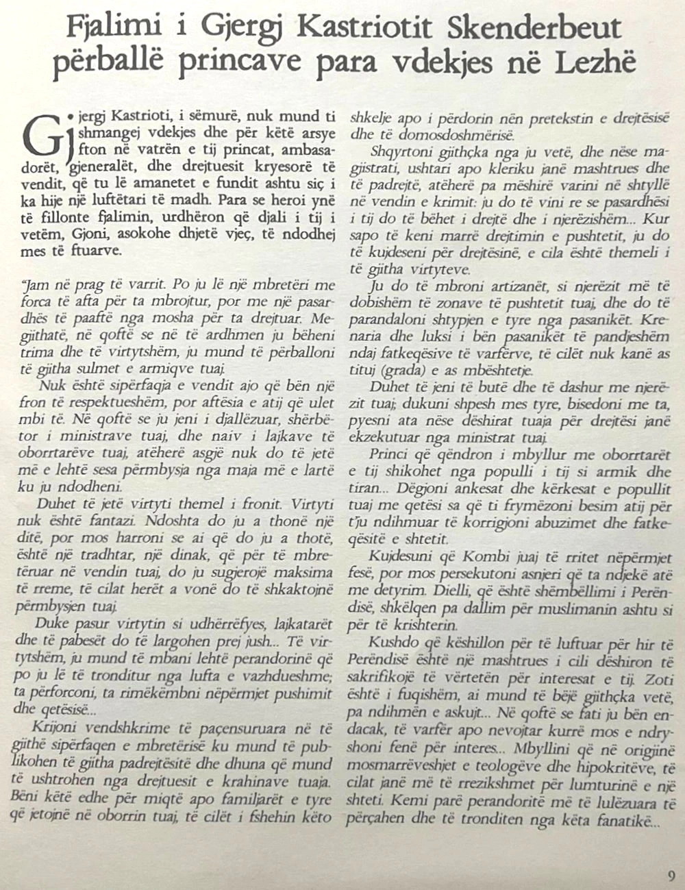 Fjalimi i më poshtëm është marrë nga libri i autorit Stephan Zannovich, me titullin «Le Grand Castriotto d’Albanie, Histoire». Teksti prej 131 faqesh është botuar në vitin 1779 nga shtëpia botuese J.J.Kesler, Frankfurt. Gjergj Kastrioti, i sëmurë, nuk mund ti shmangej vdekjes dhe për këtë arsye fton në vatrën e tij princat, ambasadorët, gjeneralët, dhe drejtuesit kryesorë të vendit që tu lë amanetet e fundit ashtu siç i ka hije një luftëtari të madh.