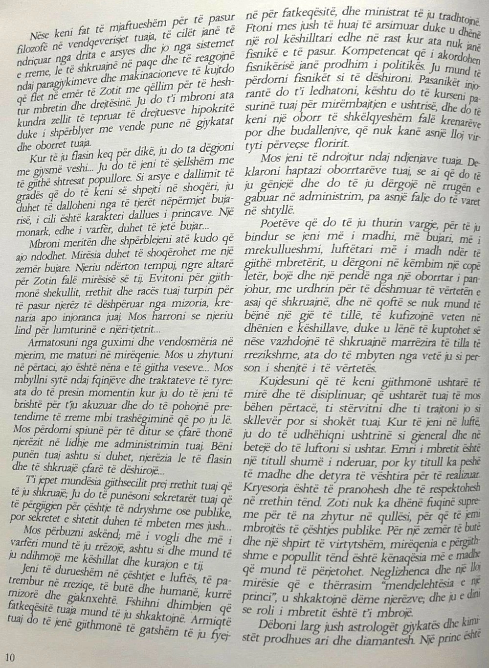 Mos jeni të ndrojtur ndaj ndjenjave tuaja. Deklaroni haptazi oborrtarëve tuaj, se ai që do të ju gënjejë dhe do të ju dërgojë në rrugën e gabuar në administrim, pa asnjë falje do të varet në shtyllë. Poetëve që do të ju thurin vargje, për të ju bindur se jeni më i madhi, më bujari, më i mrekullueshmi, luftëtari më i madh ndër të gjithë mbretërit, u dërgoni në këmbim një copë letër, bojë dhe një pendë nga një oborrtar i panjohur, me urdhërin për të dëshmuar të vërtetën e asaj që shkruajnë, dhe në qoftë se nuk mund të bëjnë një gjë të tillë, të kufizojnë veten në dhënjen e këshillave, duke u lënë të kuptohet së nëse vazhdojnë të shkruajnë marrëzira të tilla të rrezikshme, ata do të mbyten nga vetë ju si person i shenjtë i të vërtetës.