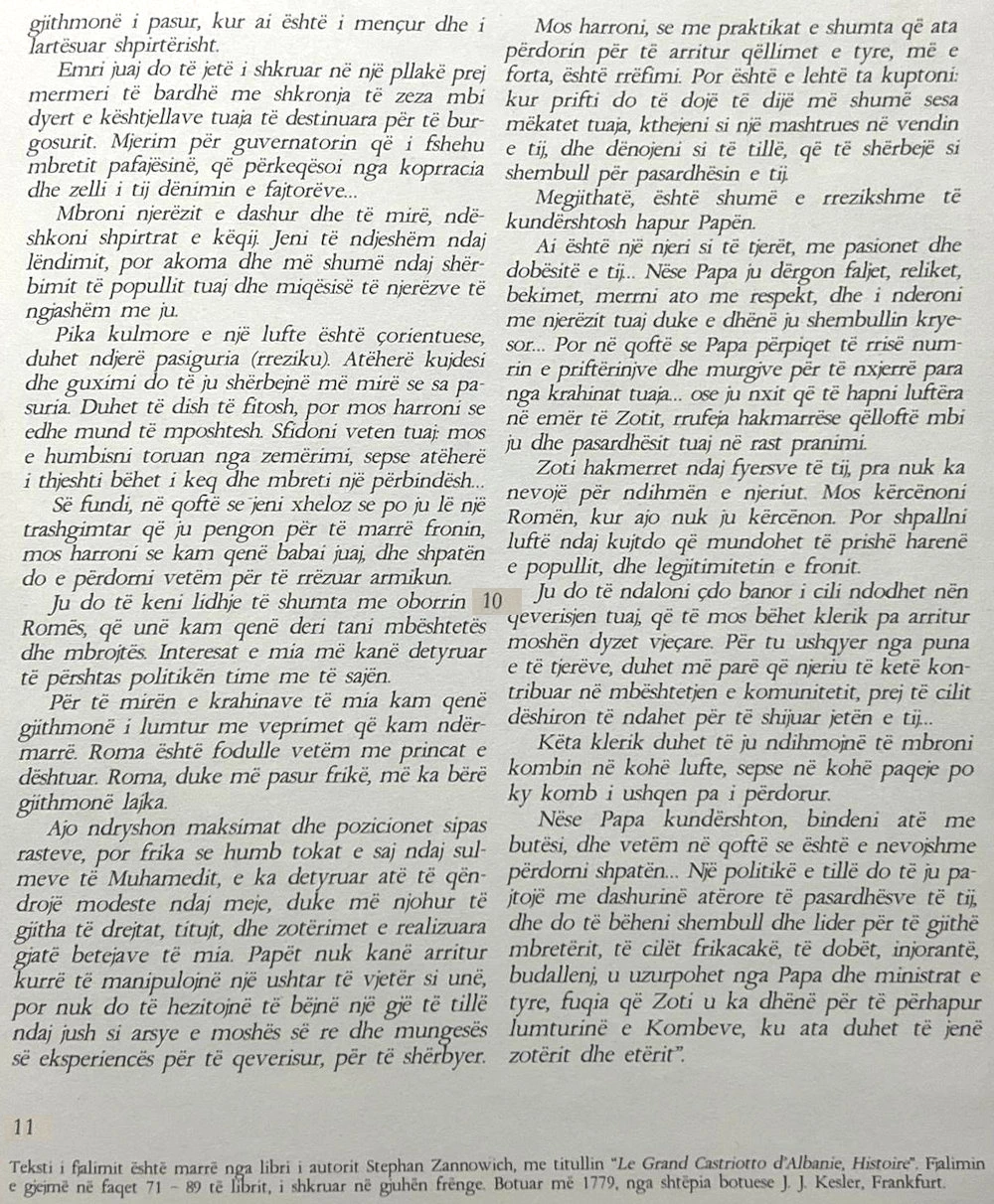 Ju do të keni lidhje të shumta me oborrin e Romës, që unë kam qenë deri tani mbështetës dhe mbrojtës. Interesat e mia më kanë detyruar të përshtas politikën time me të sajën. Rrethanat në të cilat jam gjetur veten nuk më kanë lejuar të luftoj uzurpimet turke dhe pretendimet e papës. Për të mirën e krahinave të mia kam qenë gjithmonë i lumtur me veprimet që kam ndërmarrë. Roma është fodulle vetëm me princat e dështuar.