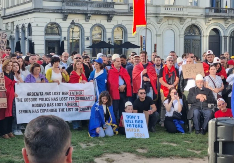 Protestë e shqiptarëve emigrantë para Parlamentit Evropian në mbrojtje të interesave të Kosovës. Këtu nuk po shihet asnjë politikan kosovar, asnjë analist kosovar — ata që duan të na e ndalin votën për atdheun tonë të shtrenjtë.