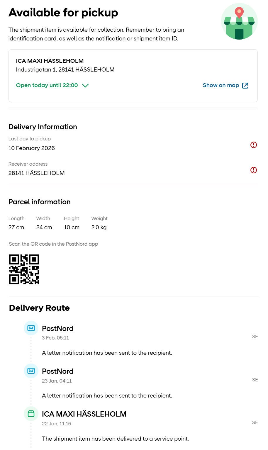 Po të nisi përgjigjen që më dha posta gjermane, sqarimi është në suedisht, e mora nga celulari i punonjësit, dhe kur erdha në shtëpi, e kërkova edhe unë (mund ta kërkosh edhe ti si ekspert që je në adresën: tracking.postnord.com, me numrin e paketës DHL: CY 4292 3085 9DE ) dhe gjeta të njëjtin informacion në anglisht, e po ta dërgoj.