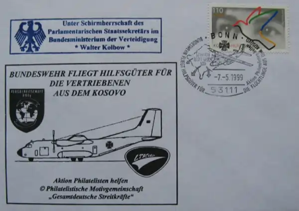 Zarfi i parë, i lëshuar në Bon më 7 maj 1999, paraqet një dokument të pastër të operacioneve humanitare të Gjermanisë gjatë krizës së kosovarëve të dëbuar në pranverën e atij viti. Në pjesën grafike qëndron një helikopter i Bundeswehr-it, i shoqëruar me tekstin: “Bundeswehr fliegt Hilfsgüter für die Vertriebenen aus dem Kosovo” (“Forcat e armatosura gjermane transportojnë ndihma për të dëbuarit nga Kosova”). Ky zarf kombinon ikonografinë ushtarake me misionin humanitar, duke e paraqitur ushtrinë jo thjesht si faktor ushtarak, por si aktor shpëtimi dhe mbështetjeje. Pulla gjermane “Kosovo-Hilfe 1999”, e cila shfrytëzon simbolin e pëllumbit shumëngjyrësh si emblemë e paqes, e shoqëron një vulë speciale me hartën e Kosovës, avionin e transportit humanitar dhe kryqin e ndihmës emergjente. Elementët kyç filatelikë dhe historikë jane mbështetja e drejtpërdrejtë e refugjatëve shqiptarë në Maqedoni dhe Shqipëri, përfshirja aktive e Gjermanisë në ndërmarrjen humanitare evropiane, dhe simbolika e përdorimit të pullës shtesë (+100 Pfennig), ku shtesa monetare dedikohej për ndihma konkrete humanitare. Ky zarf përfaqëson fazën e parë të vitit 1999, ate moment kur diplomacia dhe logjistika ushtarake u shkrinë në një përpjekje globale për të parandaluar katastrofën njerëzore.