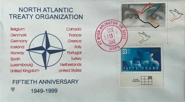 Zarfi i dytë, i vulosur në bazën ushtarake amerikane Ft. Myer, Arlington, Virginia më 13 tetor 1999, përkon me periudhën menjëherë pas përfundimit të ofensivave ajrore të NATO-s. Në pjesën e majtë, zarfi paraqet logon zyrtare të NATO-s në 50-vjetorin e themelimit (1949–1999), e shoqëruar me emrat e kombeve anëtare, duke e paraqitur Aleancën si një entitet të bashkuar. Veçanërisht domethënëse është pulla amerikane e 33 centëve për 50-vjetorin e NATO-s, e vendosur ngjitur me pullën gjermane “Kosovo-Hilfe 1999”. Ky kombinim imazhesh krijon atë që mund ta quajmë “filateli hibride”, një gjetje e rrallë që dokumenton bashkëveprimin transatlantik në ndërhyrjen për Kosovën, rolin e SHBA-së si forcë udhëheqëse e NATO-s dhe konfirmimin politik të moralitetit të ndërhyrjes ushtarake përmes simboleve të dy shteteve të ndryshme në një zarf të vetëm. Vula postare e bazës ushtarake amerikane tregon se kjo menyre ishte pjesë e komunikimit të strukturave ushtarake që ndodheshin në misione të lidhura me Kosovën. Ky zarf përfaqëson fazën e dytë, ate te konsolidimit e legjitimitetit ndërkombëtar, dhe mesazhin politik të solidaritetit euro-atlantik.