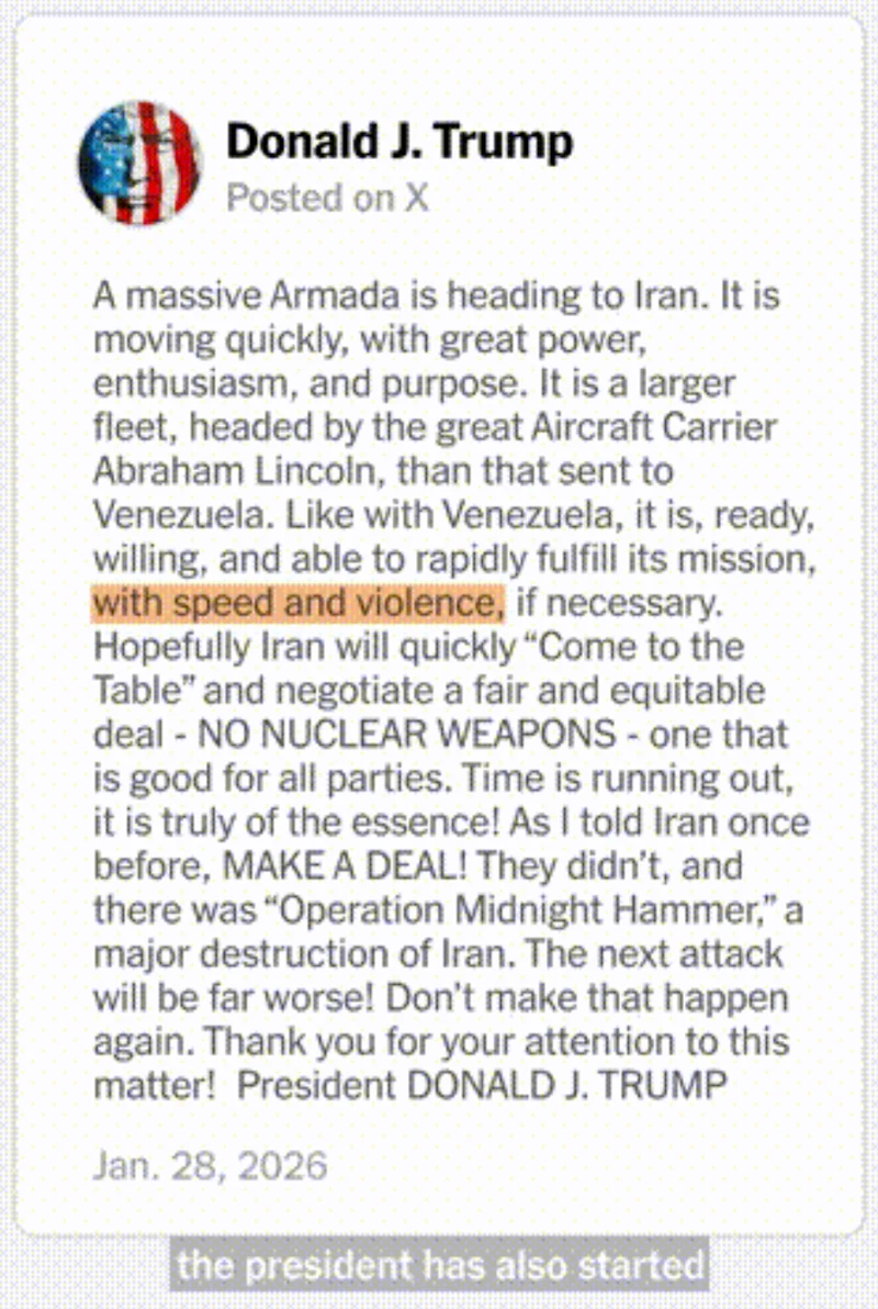 Një Armatë masive po shkon drejt Iranit. Po lëviz shpejt, me fuqi, entuziazëm dhe qëllim të madh. Është një flotë më e madhe, e kryesuar nga Aeroplanmbajtësja e madhe Abraham Lincoln, sesa ajo e dërguar në Venezuelë. Ashtu si me Venezuelën, ajo është e gatshme, vullnetplotë dhe e aftë të përmbushë me shpejtësi misionin e saj, me shpejtësi dhe dhunë, nëse është e nevojshme. Shpresojmë që Irani të “Ulet në Tavolinë” shpejt dhe të negociojë një marrëveshje të drejtë dhe të barabartë – JO ARMË BËRTHAMORE – një marrëveshje që është e mirë për të gjitha palët. Koha po mbaron, është vërtet thelbësore! Siç i thashë Iranit një herë më parë, BËJE NJË MARRËVESHJE! Ata nuk e bënë, dhe pati “Operacionin Çekani i Mesnatës”, një shkatërrim të madh për Iranin. Sulmi tjetër do të jetë shumë më i keq! Mos e bëni që kjo të ndodhë përsëri. Faleminderit për vëmendjen tuaj ndaj kësaj çështjeje!
