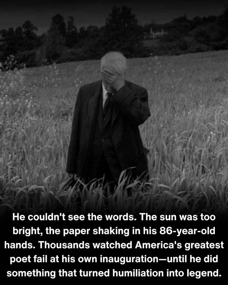 Ai nuk mund t’i shihte fjalët. Dielli ishte tepër verbues, fleta e letrës dridhej në duart e 86 vjeçarit. Mijëra vetë e panë poetin më të madh amerikan të binte në inagurimin e tij – derisa ai bëri diçka që e ktheu poshtërimin e tij në legjendë!