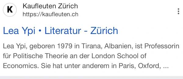 Kur një autore vjen nga një vend i vogël me një histori të madhe dhe të ndërlikuar, dhe arrin të flasë me autoritet të barabartë për komunizmin dhe kapitalizmin, për lirinë si përvojë personale dhe si koncept filozofik, për dinjitetin individual dhe përgjegjësinë kolektive, atëherë prania e saj në një qytet si Cyrihu nuk është vetëm një ngjarje letrare, por një ngjarje kulturore me vlerë shumëdimensionale. Takimi me Lea Ypin, që bashkoi fjalën e shkruar me fjalën e folur, përvojën shqiptare me përvojën ndërkombëtare, dhe filozofinë me letërsinë, ishte më shumë se një prezantim libri. Në fakt ishte një reflektim i thellë mbi historinë, kujtesën dhe njeriun në botën e sotme.