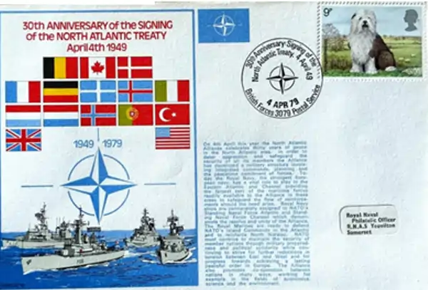 Zarfi me siper është i lëshuar më 4 prill 1979 nga Shërbimi Postal i Forcave Britanike, për të shënuar 30-vjetorin e nënshkrimit të Traktatit të Atlantikut të Veriut (1949–1979), perndryshe akti themelues i NATO-s. Në pjesën vizuale paraqiten flamujt e 12 shteteve themeluese, emblema e NATO-s dhe flotë detare britanike, duke theksuar rolin e rëndësishëm të Royal Navy në aleancë gjatë Luftës së Ftohtë. Pullën standarde të Mbretërisë së Bashkuar e shoqëron një vulosje speciale ushtarake me datën historike 4 Prill 79 dhe simbolet e NATO-s, që e bën këtë material një dokument të veçantë të historisë postare ushtarake. Teksti shoqërues përmbledh kontributin e NATO-s në sigurinë euro-atlantike dhe bashkëpunimin ndërmjet vendeve anëtare.