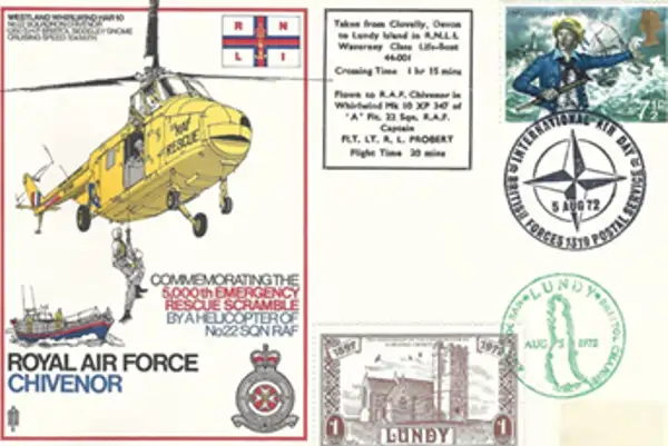 Zarfi përkujtimor ne fig.3 i vitit 1972 shënon një moment të veçantë në historinë e shpëtimit ajror britanik, duke theksuar rolin e Forcave Ajrore Mbretërore në shpëtimet detare. Helikopteri Westland Whirlwind HAR10 që ul një anëtar ekuipazhi drejt një varke shpëtimi, bashkëpunimi mes RAF dhe RNLI (Royal National Lifeboat Institution, qe do perkthehej: “Institucioni Mbretëror Kombëtar i Varkave të Shpëtimit”).