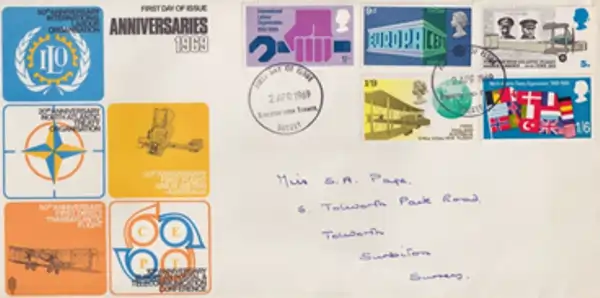 Ky zarf përkujtimor i vitit 1969 nga Britania e Madhe është një First Day Cover(emetim i dites pare), duke shenuar me imazhet e pullave disa përvjetorë të rëndësishëm ndërkombëtarë si 50-vjetorin i fluturimit të parë direkt transatlantik dhe i fluturimit nga Britania në Australi., 50-vjetorin i Organizatës Ndërkombëtare të Punës (ILO), 10-vjetorin e Konferencës Evropiane të Postës dhe Telekomunikacionit (CEPT) dhe se fundi 20-vjetori i NATO-s (1949–1969). Në thelb, ky zarf përmbledh arritje të mëdha në fushën e punës, komunikimit, aviacionit dhe sigurisë ndërkombëtare, duke i dhënë një pamje të gjerë të botës së vitit 1969.