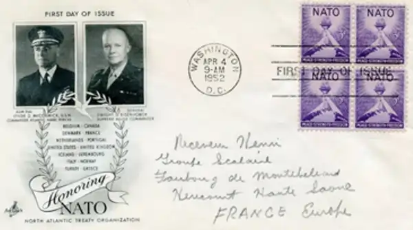 Zarfi përkujtimor i datës 4 prill 1952 nga Washington, D.C. është një First Day Cover (emetim ne diten e pare) kushtuar NATO-s, qe percjell si nderimin e NATO-s si aleancë e re pas Luftës së Dytë Botërore, me mesazhin “Paqe – Forcë – Liri”, me portretet e Dwight D. Eisenhower (Komandant Suprem Aleat) dhe Admiral Lynde D. McCormick (Komandant i Forcave Detare Atlantike). Zarfi ka si dekorim pëllumbin e paqes dhe kurorë dafine, që përfaqëson idealin e bashkëpunimit ndërkombëtar, dhe listimin e 14 vendeve anëtare të NATO-s në atë kohë (nga Belgjika deri te Greqia), që pasqyron optimizmin dhe propagandën e aleancës për paqe dhe siguri kolektive. Ky zarf është një artefakt historik dhe filatelik që dokumenton fillimet e NATO-s dhe simbolikën e saj si garant i paqes dhe lirisë në epokën e pasluftës.