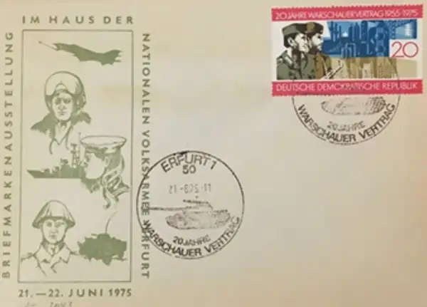 Ne zarfi i fig 6, nga Gjermania Lindore (DDR), i datës 21 qershor 1975, është i lidhur me 20-vjetorin e Traktatit të Varshavës (1955–1975) dhe shfaqet se pari ne ekspozitën filatelike te organizuar në Erfurt. Imazhet pasqyrojne përkujtimin e aleancës ushtarake socialiste, te paraqitur si simbol i forcës dhe unitetit, neprmjet lustrimit me avion dhe anije luftarake, nje ushtar dhe nje grua me uniformë, që përfaqësojnë bashkëpunimin jo vetem ndërarmësh, por dhe dhe rolin e gjithe popullit ne mbrojte nga imperializmi perendimor.