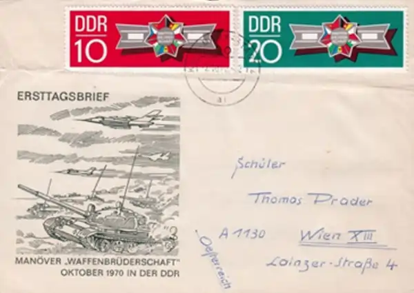 Ne fig.7 tregohet zarfi përkujtimor dhe njeheresh edhe i qarkulluar, nga Gjermania Lindore (DDR), i lëshuar në tetor 1970, i cili lidhet me stërvitjen ushtarake të quajtur “Waffenbrüderschaft” (Vëllazëria e Armëve). Nepermjet imazheve tregohet stërvitje e përbashkët e ushtrive të vendeve të Traktatit të Varshavës, që synonte të tregonte unitetin dhe fuqinë e aleancës socialiste. Ilustrim me tanke dhe avionë në lëvizje, shenjë e forces ae koordinimit tokësor dhe ajror.