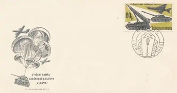 Zarfi i fig.8, i lëshuar nga posta e Çekosllovakisë më 1966, lidhet me stërvitjen ushtarake të Traktatit të Varshavës të quajtur “Vltava”, qe aleanca ushtarake e vendeve të bllokut lindor gjatë Luftës së Ftohtë, zhvillonte si kundërpeshë ndaj NATO-s. Kjo stervitje ushtarake ishte një manovër e madhe e përbashkët, ku ushtritë e vendeve anëtare testuan koordinimin dhe aftësitë e tyre.Ilustrimi në të majtë paraqet një tank që zbret me parashutë nga avionët, simbol i fuqisë dhe mobilitetit ushtarak te bllokut, me shkrim në gjuhën çeke: “Cvičení armád Varšavské smlouvy ‘Vltava’ Československá pošta” ( qe ne shqip do perkthehej: “Stërvitja e ushtrive të Traktatit të Varshavës ‘Vltava’ Posta Çekosllovake”), dhe pulla postare paraqet një raketë dhe një avion luftarak, duke nënvizuar teknologjinë moderne ushtarake.