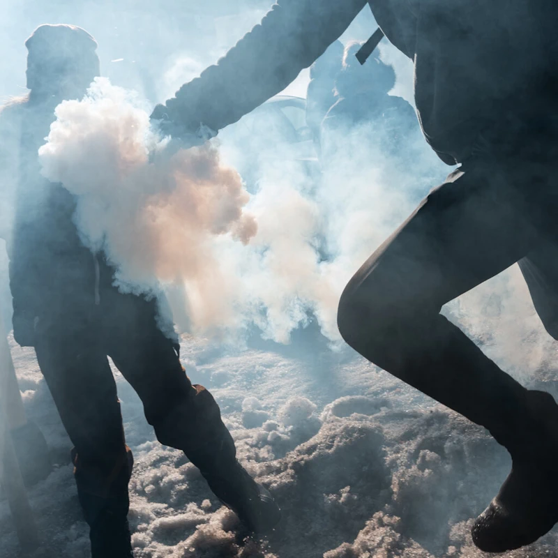 Një person i dukshëm vetëm nga gjoksi poshtë vrapon ndërsa mban një granatë tymi në një rrugë me dëborë.