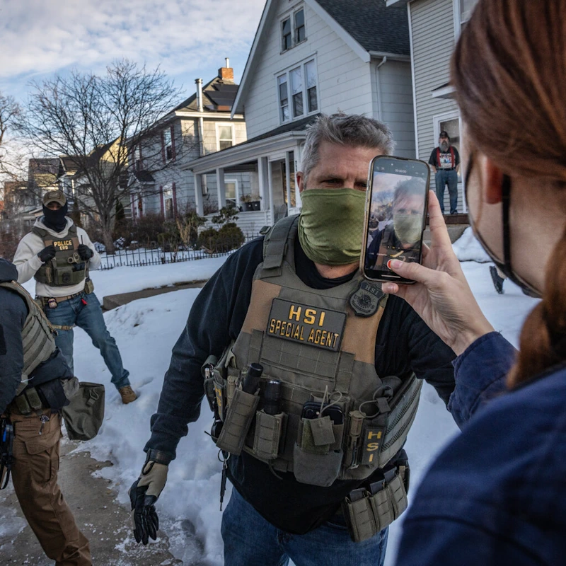Në një rrugë banimi me dëborë, një person përdor një celular për të kapur videon e një burri të maskuar, që mban një jelek që thotë “agjent special i HSI-së“.