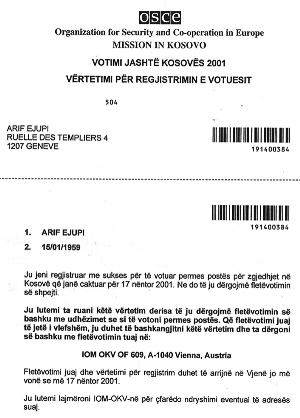 Dëftesa zyrtare e OSBE-së, për votimin me postë të autorit, gjatë zgjedhjeve të pasluftës. Dokument i procedurave të vështira, afateve strikte dhe përkushtimit të diasporës për të kontribuar në proceset demokratike të Kosovës.