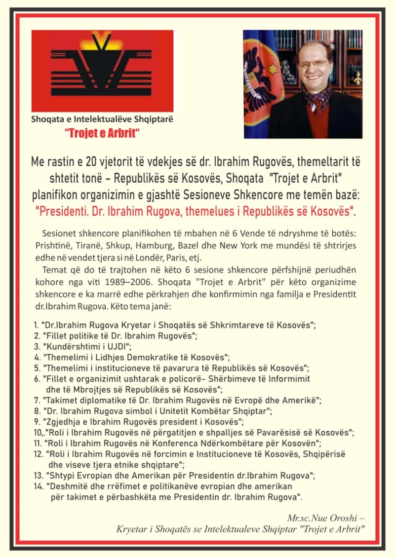 Me rastin e 20 vjetorit të vdekjes së dr. Ibrahim Rugovës, themeltarit të shtetit tonë – Republikës së Kosovës, Shoqata “Trojet e Arbrit” planifikon organizimin e gjashtë Sesioneve Shkencore me temën bazë: ”Dr. Ibrahim Rugova, themelues i Republikës së Kosovës”.
