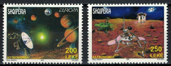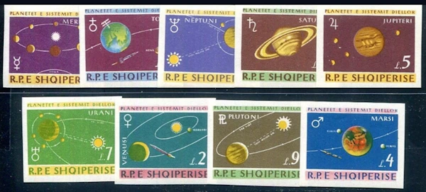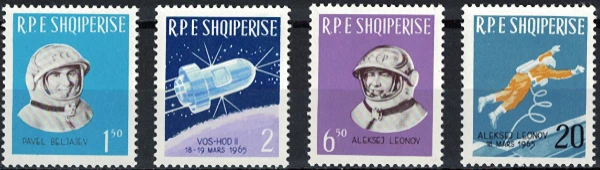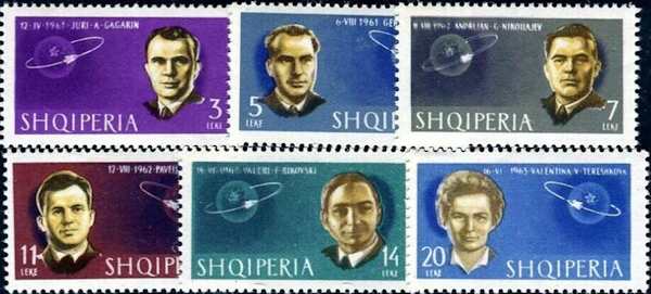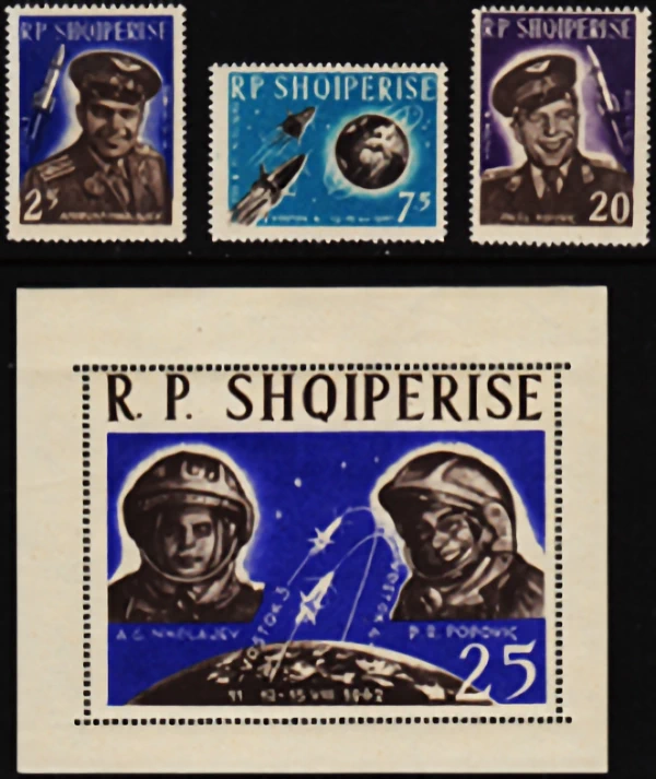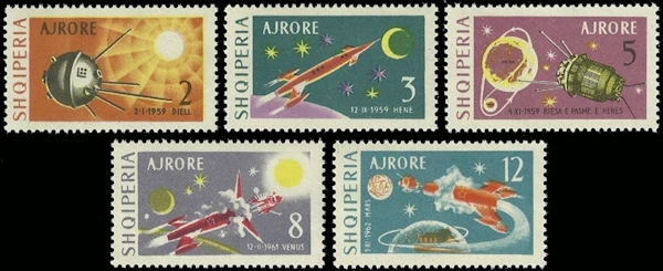 Në vitet ‘60 e në vijim, tematika teknologjike u zgjerua me përfshirjen e arritjeve në shkencën dhe teknologjinë hapësinore, të cilat dominonin diskursin global të kohës. Gara hapësinore midis SHBA-së dhe Bashkimit Sovjetik frymëzoi një sërë emetimesh filatelike në mbarë botën. Edhe Shqipëria kontribuoi në këtë trend, megjithëse kryesisht duke pasqyruar suksese të vendeve aleate të kampit lindor, si vendosja e satelitëve, misionet kozmike dhe arritjet e astronautëve sovjetikë.