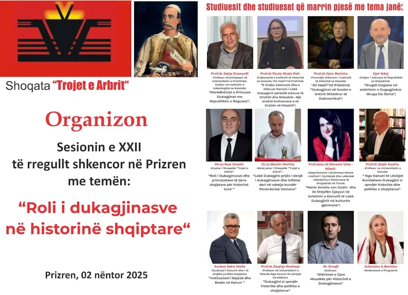 Shoqata “Trojet e Arbrit” nuk e përmbylli aktivitetin vjetor me këto sesione shkencore dhe akademi promovuese por ajo kishte përgaditur organizimin e një sesion shkencor madhështor të historisë se Mesjetës shqiptare. Kësaj radhe tema bosht ishte: “Roli i dukagjinasve në historinë shqiptare”. Ky sesion shkencor u mbajtë në qytetin e Kastrioteve dhe Dukagjinasve në Prizrenin historik më 2 nëntor 2025. Studiuesit që paraqitën temat e tyre ishin: prof.dr.Jahja Drançolli, prof.dr.Teuta Shala-Peli, prof.dr.Gjon Berisha, Dr.sc.Gjet Ndoj, Dr.sc.Besim Morina, prof.asoc.dr.Rovena Vata Mikeli, Prof.dr.Zeqirja Rexhepi, Prof.dr.Zeqir Kadriu, Avokat Ndre Mollën dhe studiuesi Ilir Zmalaj.