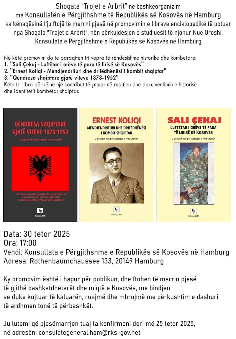 Shoqata “Trojet e Arbrit” në bashkëorganizim me Konsullatën e Përgjithshme të Republikës së Kosovës në Hamburg më,30 tetor 2025 bëri promovimin e librave enciklopedikë:”Sali Çekaj – Luftëtar i orëve të para të lirisë së Kosovës”, “Ernest Koliqi – Mendjendrituri dhe dritëdhënesi i kombit shqiptar” dhe “Qëndresa shqiptare gjatë viteve 1878-1952”.