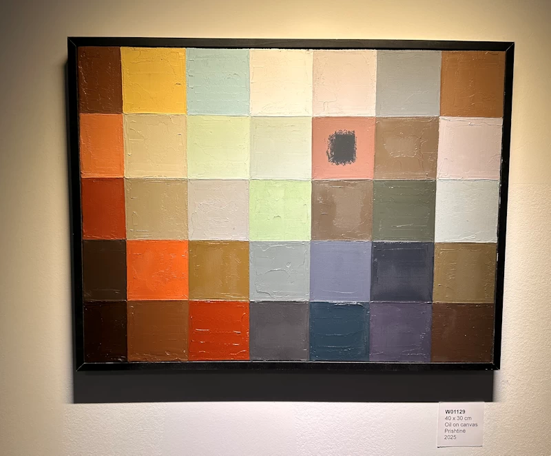 Struktura e rrjetit krijon një rend që në pamje të parë sugjeron racionalitet dhe kontroll, por brenda këtij rendi zhvillohet një lëvizje e heshtur e ngjyrave, një dridhje e brendshme që e prish çdo stabilitet të plotë. Kjo e bën sipërfaqen të duket si një fushë ku perceptimi nuk vendoset, por vazhdimisht negocion me atë që mund të shihet dhe atë që i shpëton shikimit. Ngjyra këtu nuk është thjesht cilësi optike, ajo funksionon si gjendje. Tonet e errëta tokësore bartin një peshë të heshtur, ndërsa ndërhyrjet më të ndritshme krijojnë çarje në këtë densitet. Në këtë tension, për Johannes Ittenin ngjyra nuk ishte vetëm fenomen fizik, por përvojë e brendshme dhe pikërisht në këtë nivel këto punime fillojnë të artikulohen si hapësira të ndjeshmërisë, jo vetëm të shikimit. Fragmenti, i përsëritur në mënyrë modulare, nuk e humb individualitetin e tij. Çdo katror mbetet një botë e vogël e mbyllur, por njëkohësisht i detyruar të ekzistojë në raport me të tjerët. Kjo marrëdhënie e brishtë ndërmjet pjesës dhe tërësisë evokon një logjikë që mund të lidhet me intuitën poetike të Paul Klee, ku forma nuk është përfundim, por proces, një gjendje në zhvillim të vazhdueshëm.