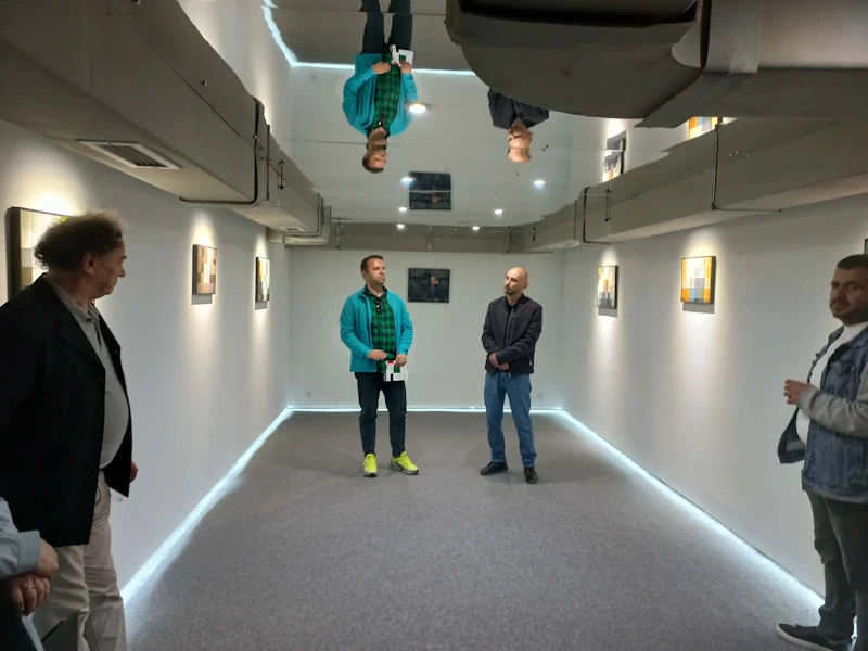 “Dëshmitarët e pikseluar”, një titull domethënës që e krijon në ekspozitën e tij Hekuran Sokoli, me kuptim poetik e filozofik, një përballje me figura të fshehura prapa katrorëve, të fragmentuara në njësi digjitale gjatë punës së tij si gazetar, prodhon një tension të ndjeshëm mes të dukshmes dhe të padukshmes. Në ekran, dëshmitarët nuk shfaqen më si identitete të plota, por si struktura të përkohshme ngjyrash, si prani që lëvizin ndërmjet shfaqjes dhe zhdukjes. (frymëzuar nga ekranet televizive, prania e dëshmitareve me kokë të mbuluar, imazh katrori). Pikërisht në këtë hapësirë liminale lind impulsi për t’i përkthyer këto imazhe në gjuhën e pikturës. Këto konfigurime vizuale, të ndërtuara mbi ritme gjeometrike dhe ndërthurje kromatike, rezonojnë me disiplinën formale të Bauhaus-it, si dhe me ndjeshmërinë e pikturës së Paul Klee dhe teorinë e ngjyrës së Johannes Itten. Në këto punime, katrori nuk paraqitet më si një njësi neutrale formale, por si një pikë ndërmjetëse mes pranisë dhe mungesës.